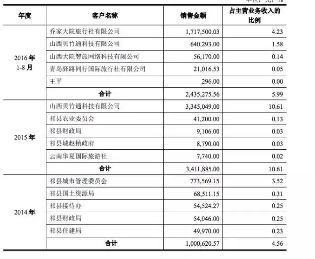 同时,乔旅公司2015年的前五大销售客户中,第二到第四大客户均为政府部门,分别为祁县农委会、祁县财政局、祁县城赵镇政府,销售金额分别为4.12万元、9106元、8790元。2014年,乔旅公司的前五大客户均为政府部门,累计销售金额100.06万元。