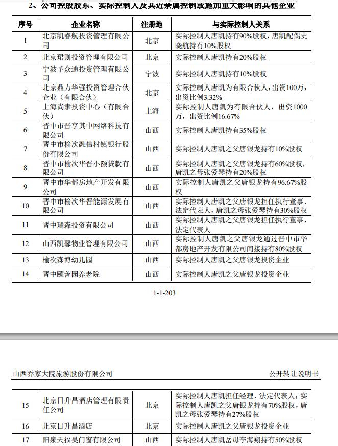 晋中紫金煤业从事煤炭开采经营,其股东名单中晋中瑞森投资有限公司持股17.5%。晋中瑞森投资执行董事为唐银龙,晋中瑞森投资的监事范伟,与乔旅公司现任董事长同名。而唐凯之母张爱琴持有30%股权的晋中市榆次华晋能源发展有限公司也有从事煤炭相关产业,该公司另外70%股权由晋中市华都房地产开发有限公司持有,唐凯之父唐银龙持有其96.67%股权