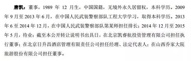 资料显示,唐凯1989年12月生,仅27岁出头。2014年12月至2015年5月,曾经待业半年。曾在中国人民武装警察部队工程大学学习,取得本科学历;后在中国人民武装警察部队第某师担任排长。唐凯通过景世恒华持有乔旅公司32%的股份,为公司的实际控制人。