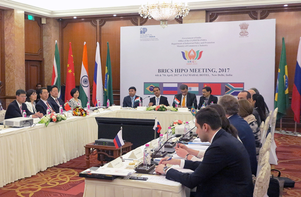当地时间4月6日上午,第八届金砖国家知识产权局局长会议在印度新德里举行。中国国家知识产权局局长申长雨,巴西工业产权局局长路易斯·奥特维·皮曼塔尔,俄罗斯联邦知识产权局局长戈利高里·伊夫利耶夫,印度专利、外观设计、商标和地理标志局局长欧姆·帕卡什·古普塔,南非公司与知识产权注册局局长罗伊·沃勒出席会议。(知识产权报 通讯员 韩国卿 文/摄) |