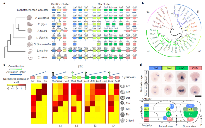 a:虾夷扇贝Hox基因的组成;b:扇贝与其它冠轮动物Hox基因的聚类分析;c:转录组分析表明Hox基因在表达时间上呈现分段共线性;d:四种leading Hox基因在扇贝胚胎中呈空间共线性表达。