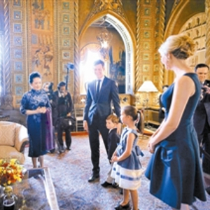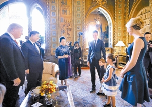 下午5时许,习近平和夫人彭丽媛抵达海湖庄园,特朗普和夫人梅拉尼娅在停车处热情迎接。两国元首夫妇合影留念,亲切交谈。两国元首夫妇共同欣赏了特朗普外孙女和外孙演唱中文歌曲《茉莉花》并背诵《三字经》和唐诗。