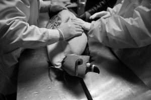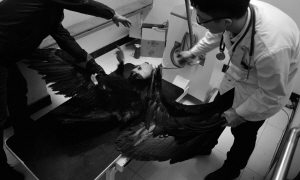 座山雕来沈疗伤 ■本组图片由华商晨报主任记者 王齐波 摄 座山雕戴上眼罩穿上保护衣 本报讯(华商晨报主任记者 王齐波)4月6日,康平县一村民发现了一只受伤的国家二级保护动物秃鹫(俗称座山雕),翅膀等处有伤口,已失去飞翔能力。 当天,这只秃鹫被送到沈阳一家动物医院进行系列检查,对外伤部分进行了简单治疗。 沈阳猛禽救助中心王维彦老师介绍,4月6日,康平县一村民发现了这只受伤的秃鹫后,联系了当地的野保部门,随后他们又联系到了沈阳市林业局野生动物保护站。随后,沈阳猛禽救助中心负责人将送到沈阳的秃鹫送往动物医院。 经过外部观察以及仪器检查,医生诊断这只秃鹫受了内伤以及翅膀处外伤。 负责救助的姜医生分析,翅膀上的外伤是受外力撞击所致,很可能撞到了电线杆上,内伤极有可能是高空坠落时摔伤所致。他解释说,就好比秃鹫在高空飞行时,因自身或者外力作用,突然坠落到地面上,强大的冲击力导致受伤严重。 这只秃鹫翼展三米多,属于亚成年鸟,体重达15斤左右。因为当天它的体况不好,身体虚弱,医院对其进行了护理。“内伤比外伤更不好处理,观察一下再看看。”姜医生说。 这只秃鹫野性十足,虽然有伤在身,但凶猛的动作还是让人猝不及防,不停地用利嘴啄人。对此,医生先给它戴上了眼罩,这样这只大鸟顿时老实了不少。 姜医生介绍,这只秃鹫的伤情非常复杂,翅尖的外伤比较好处理,内伤就得观察一段时间了。 为了让这只凶猛的座山雕不再受到二次伤害,王维彦老师还特地给它准备了一件“外衣”,在做好相应的治疗后,工作人员一起给秃鹫穿上了起着保护作用的衣裳。 |