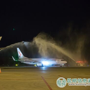 瑞丽航空第十二架波音客机抵达昆明机场,通过隆重的水门仪式。记者上官艳君摄