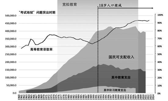日本数量庞大的中产阶级家庭无疑为上述私营教育机构作出了巨大的经济贡献。在日本国民可支配收入中,教育支出和补习教育支出从1970年左右开始显著上升,1976年开始实施的“宽松教育”政策完全没有影响到这个上升趋势。换言之,1976至1995的20年间,家庭的教育经济负担没有下降,反而一路攀升,更可怕的是,升学率却一路下滑至1970年后的最低谷。可想而知,在此期间的学生和家庭的升学压力越来越大,对家庭经济条件不够好的学生而言,不公平也在扩大。