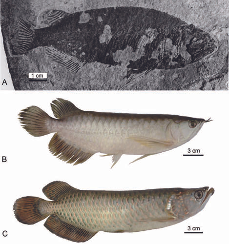 图3 中华金龙鱼化石(A)与东南亚的美丽金龙鱼(B)及澳大利亚的雷卡德金龙鱼(C)对比(张江永供图)