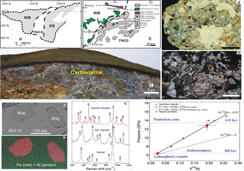 图1 华北克拉通中北部的内蒙古丰镇和河北怀安一带的碳酸岩内发现的含有超硅石榴石的榴辉岩捕虏体