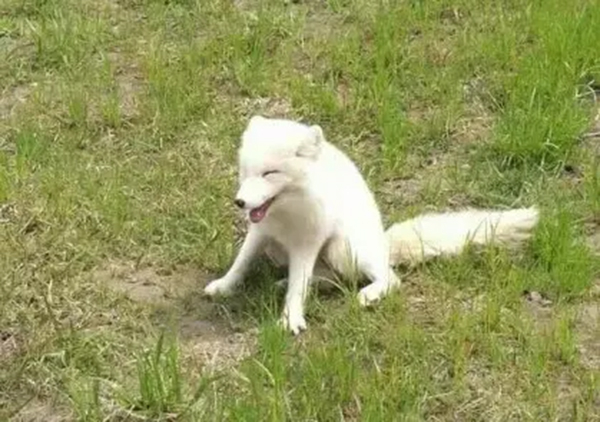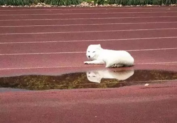 那天中午11点不到,我正从办公室下楼,听到有一位同事说操场上有只白色的动物,我就跑去看了看,这个动物个头不大,跟狗差不多,嘴巴尖尖的,尾巴又长又粗,看起来又不像狗。我慢慢靠过去,它没跑,而是发出呜呜的叫声,感觉身体有些虚弱,两只眼睛一直盯着我。