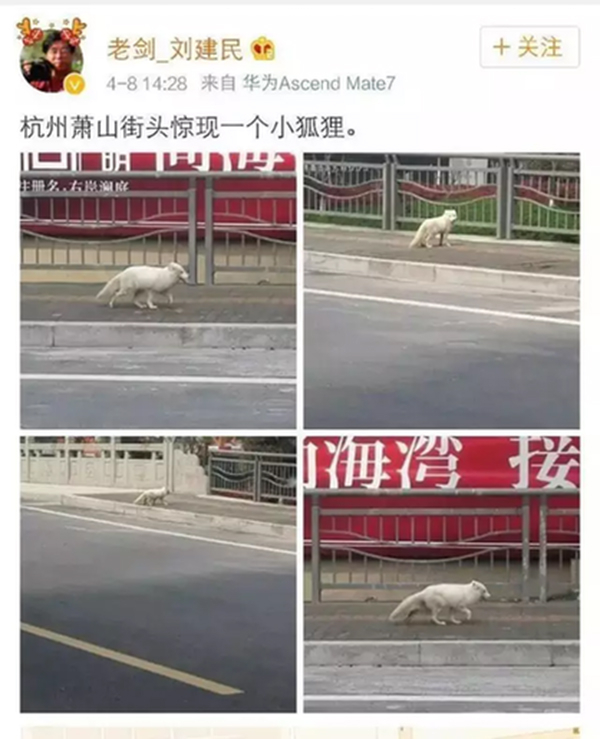 离萧山十一中最近的某小区保安说,4月9日下午,他曾看到这只白狐从西往东跑,毛发不像照片上那么干净,有点脏,后腿一瘸一瘸,好像受伤了。