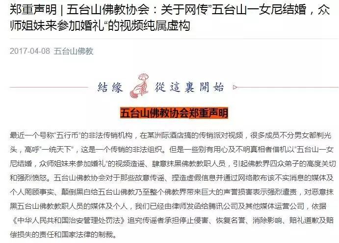 针对此事,五台山佛教协会发表声明称,最近一个号称“五行币”的非法传销机构,在某洲际酒店搞的传销派对视频,很多成员不分男女都剃光头,高呼“一统天下”,这是一个传销的非法组织。但是一些别有用心及不明真相者借机以“五台山一女尼结婚,众师姐妹来参加婚礼”的视频造谣、肆意抹黑佛教教职人员,引起佛教界四众弟子的高度关切和强烈愤怒。