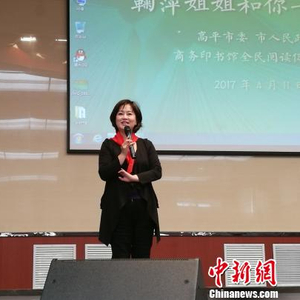 著名儿童节目主持人鞠萍11日在山西省晋城市高平六中分享自己的成长经历和阅读故事。图为鞠萍请学生们上台讲述自己的阅读经历。 李娜 摄
