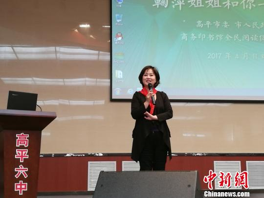 著名儿童节目主持人鞠萍11日在山西省晋城市高平六中分享自己的成长经历和阅读故事。图为鞠萍分享自己的成长经历。 李娜 摄
