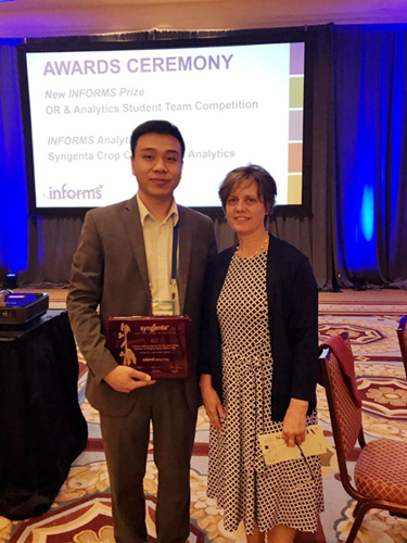 史忠顺代表团队参加颁奖典礼在此次竞赛中,侍乐媛教授团队提交的论文题目为A Decision Making Approach for Soy Seed Variety Selection via Hedging Against Weather Risk,创新性地提出了综合利用大数据分析技术、深度神经网络构建出农业产量预测模型的思路,并在此基础上设计出基于混合整数二次规划的最优求解策略,创造性地解决了农作物选种最优决策配比的问题。该方案的创新之处在于运用协方差矩阵对冲由天气不确定性所带来的风险,同时将大数据技术、深度学习技术与最优化理论和方法相结合,开发出针对国家粮食产量精准预测与备种优化策略的决策分析支持工具,具有很强的可推广性。国际运筹学与管理科学协会(INFORMS)评奖委员会对该解决方案给予一致肯定,评奖委员会主席IBM Research、T.J. Watson Research Center产业研究首席科学家Robin Lougee和Syngenta公司的首席科学家Joseph Byrum称其具有重要的理论价值与现实意义。