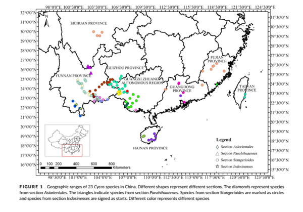 中国科学院昆明植物研究所龚洵研究组一直致力于苏铁属植物的系统发育和保护生物学的研究,并结合地质活动和气候变迁探讨其物种多样性和遗传多样性的起源、演化,为其有效保护提供理论依据。而以往研究提出的保护策略大多针对特定苏铁物种或类群,尚缺乏对已报道的中国的苏铁属物种提出系统性的遗传多样性水平比较和保护建议。近日,该研究组博士郑颖基于近二十年来苏铁类植物的系统分类和遗传多样性研究进展,综述了中国苏铁属植物的分布格局(如图)、遗传多样性、遗传结构和保护现状;在物种水平上,中国苏铁属植物具有较高的遗传多样性,居群间遗传分化显著;中国西南地区的大部分苏铁物种在第四纪冰期经历了居群收缩事件,而沿海分布的物种却发生了居群扩张;人类活动和生境破碎化是导致苏铁濒危的主要因素。此外,通过综述前人在苏铁类植物保护方面做出的贡献,该文进一步提出了六点建议,以期为苏铁类植物等其它濒危植物提供参考。