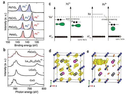 图2:(a)Pb的硬线X光电子谱,表明PbCoO3中Pb2+:Pb4+ = 1:3;(b)Co的软线X光吸收谱,表明PbCoO3中Co2+:Co3+ = 1:1;(c)PbCoO3中Pb2+与Pb4+屏蔽效应示意图;(d)(e)Pb2+与Pb4+屏蔽电荷分布计算结果示意图。