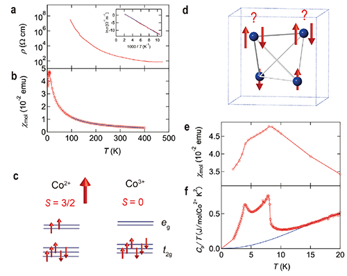 图3:PbCoO3温度依赖的(a)电阻以及(b)磁化率;(c)高自旋Co2+与低自旋Co3+离子自旋态示意图;(d)磁性离子Co2+构成四面体几何阻挫示意图;低温下PbCoO3的(e)磁化率与(f)比热,表明该体系经历了两个长程反铁磁相变。