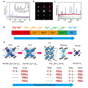 图1:PbCoO3的(a)同步辐射XRD;(b)中子衍射;(c)电子衍射图谱;(d)PbMO3系列化合物电荷形式的系统变化;(e)高压或高温下PbCoO3特殊电荷态与晶体结构的可能变化。