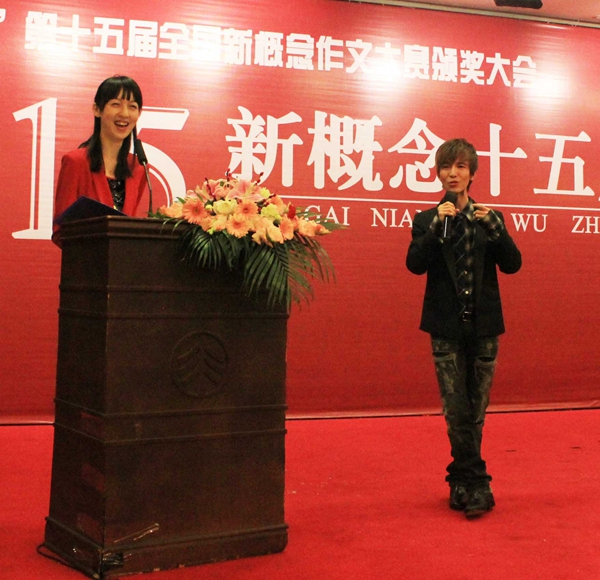 15周年庆典节目主持人麻宁(第五届大赛一等奖)与郭敬明。