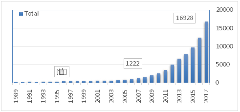 竞赛历年参赛队数统计(每队3人),本年度全球参赛人数约5万大学生