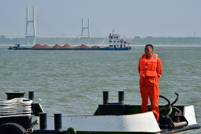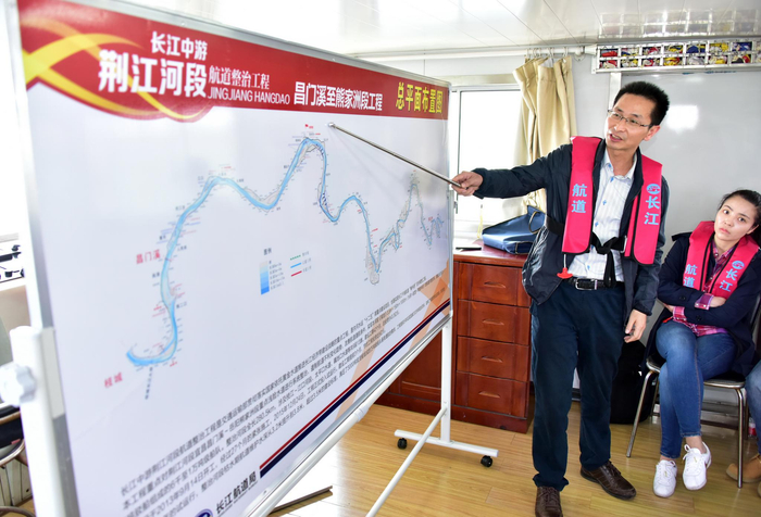 14日下午,在荆江河段航道工程现场,交通运输部长航局副局长魏志刚告诉记者,2016年,长江干线货物通过量23.1亿吨,占全国内河的三分之二,稳居世界内河首位。目前长江已成为世界运量最大、通航最繁忙的河流。