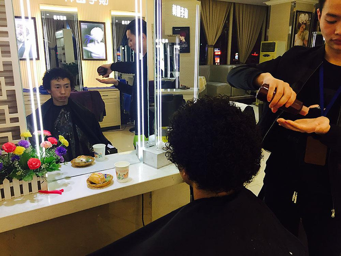 而在此之前的3小时,记者陪他完成了一件“大事”:烫头发。