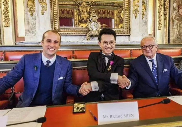 ▲通灵珠宝董事长兼CEO沈东军与Leysen1855第五代及第六代传人在品牌交接签约现场