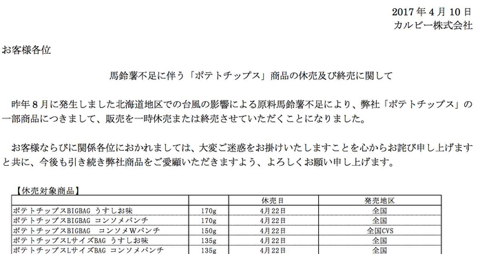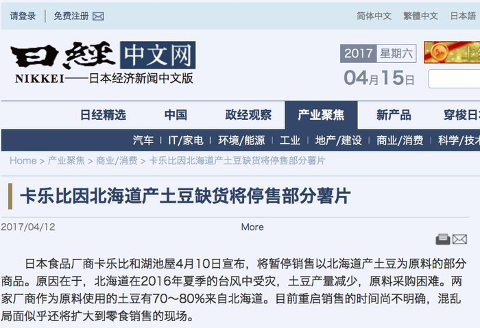 4月10日,日本食品厂商卡乐比和湖池屋宣布,将暂停销售以北海道产土豆为原料的部分商品。原因在于,北海道在2016年夏季的台风中受灾,土豆产量减少,原料采购困难。两家厂商作为原料使用的土豆有70~80%来自北海道。目前重启销售的时间尚不明确。