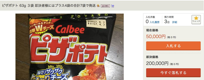 但更令人惊讶的是,每经小编(微信号:nbdnews)在雅虎日本公司的拍卖网站发现,目前,部分薯片的价格还有更高的。例如,3袋装的63克卡乐比披萨风味薯片价格目前已经炒到了5万日元,即一袋16600日元(约合1000元人民币)。不过,拍卖网站显示,目前尚没有买家以如此高的价格拍下这些薯片。
