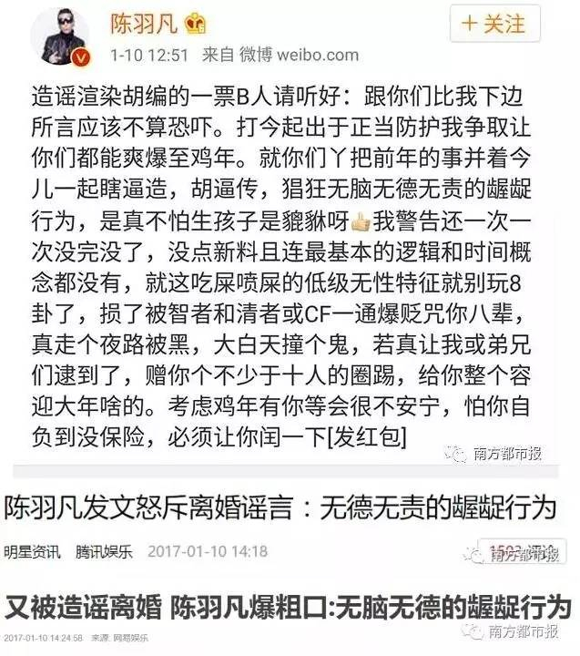 甚至就在今年1月,陈羽凡还曾发微博怒斥造谣其离婚者,言辞激烈……