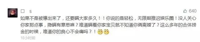 面对这样的反转,吃瓜群众炸了,“人与人之间最基本的信任都没有了”“居然还秀了差不多两年恩爱,也不知道是该觉得悲哀还是恶心”“不知道娱乐圈这样的假夫妻还有多少,不公开离婚真的是为了孩子吗”