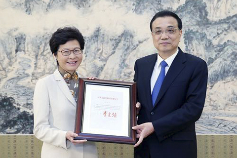 (国务院总理李克强4月11日上午在中南海紫光阁会见林郑月娥,颁发任命她为中华人民共和国香港特别行政区第五任行政长官的国务院第678号令。)