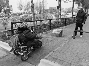 沈阳航空航天大学地铁C口附近,人行道上的石礅挡住残疾人三轮车行进 ■华商晨报主任记者 闻英奇 摄 本报讯(华商晨报主任记者 闻英奇)人行道上低矮的护栏阻拦了谁?城管:防止小商小贩占道。残疾人:行动不便人士无法从此处通过。 600米人行道安装9处护栏 残疾人回家需绕行机动车道 日前,记者接到市民周女士反映,沈阳市沈北新区道义南大街蒲昌路到沈北路东侧人行道上,600米长的人行道上安装了9处护栏,作为一名残疾人,出了地铁无障碍电梯后,只能勉强从其中一处缝隙较大的位置通过,其余路段的残疾人缓坡被加装了石礅阻隔,通行只能绕到机动车道上。 昨日8时许,记者来到地铁二号线沈阳航空航天大学站电梯处,乘坐残疾人电动代步三轮车的周女士为记者现场演示了被困的尴尬。 从无障碍电梯处向B口行进时,周女士的三轮车被距离地面约40厘米高的护栏阻隔。记者注意到,两个护栏间的距离在30厘米左右。周女士的代步车根本无法通过。 随后周女士沿着人行道向沈北路方向前进,记者注意到,从此开始的4个设置有隔离护栏的人行路口的缓坡或被隔离护栏占据,或在无障碍缓坡处被隔离护栏阻断。周女士只能在机动车道上通行,沿路的机动车呼啸着从周女士身边经过,带来了安全隐患。 “三轮代步车相比轮椅,宽度上要稍微小一些,护栏的间距对轮椅车来说根本无法通过,还有轮椅多为人力驱动,通过时需要躲避护栏或石礅,给行动不便的人士带来非常大的麻烦。”周女士说。 昨日正值早高峰,一名环卫清洁人员抱怨,间距极小的护栏间,盛装垃圾的三轮车根本无法通过,环卫清洁人员只能拖着装满垃圾的袋子往返于护栏内外。 道义城管局:阻挡小贩占道 本周三调整加宽护栏空隙 对于安装护栏的原因,周女士得到道义城管部门的反馈称,为了隔离小商小贩造成环境混乱。 记者注意到,昨日早高峰期间,隔离护栏并未阻拦住小商贩的脚步,8时20分,在地铁B出站口,附近聚集了七八个小商贩。一名摊贩告诉记者,早晨她将车辆从护栏外搬到护栏内,并没有城管人员进行管理。 在附近的环卫工人口中,记者了解到,当地城管部门只在每天12时左右会对小商贩进行劝离,隔离护栏并未起到真正阻挡的作用,特别是每天10点半前和下午3点以后,因为位于地铁出入口,客流量大,隔离护栏内都会聚集大量小商贩,每天早晨都会清理出大量垃圾。 随后记者来到沈北新区城市管理和行政执法局道义分局,该局负责人告诉记者,该路段从去年开始加装隔离护栏,到今年3月份,对部分位置进行了加装。今年清明节前接到了市民投诉,本周三将协调相关部门对相关部位的隔离护栏进行调整,初步调整方案为隔离护栏间距加宽到80厘米,以方便残疾人员出行。 |