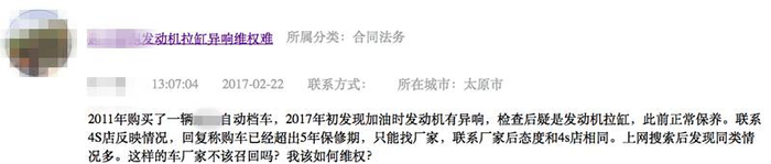 2011年购买了一辆某品牌自动档车,2017年初发现加油时发动机有异响,检查后疑是发动机拉缸,此前正常保养。联系4S店反映情况,回复称购车已经超出5年保修期,只能找厂家,联系厂家后态度和4s店相同。上网搜索后发现同类情况多。这样的车厂家不该召回吗?我该如何维权?