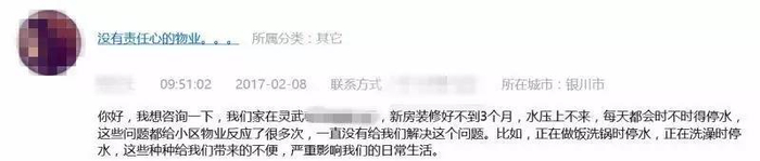你好,我想咨询一下,我们家在灵武某小区居住,新房装修好不到3个月,水压上不来,每天都会时不时地停水,这些问题都给小区物业反映了很多次,一直没有给我们解决这个问题。比如,正在做饭洗锅时停水,正在洗澡时停水,这种种情况给我们带来的不便,严重影响了我们的日常生活。