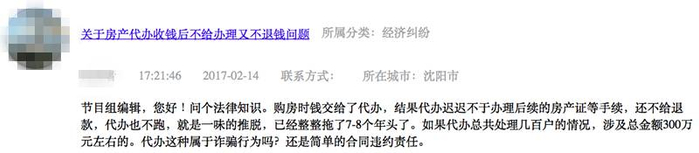 购房时钱交给了代办,结果代办迟迟不于办理后续的房产证等手续,还不给退款,代办也不跑,就是一味的推脱,已经整整拖了7-8个年头了。如果代办总共处理几百户相关业务,涉及总金额300万元左右。代办这种属于诈骗行为吗?还是简单的合同违约责任。