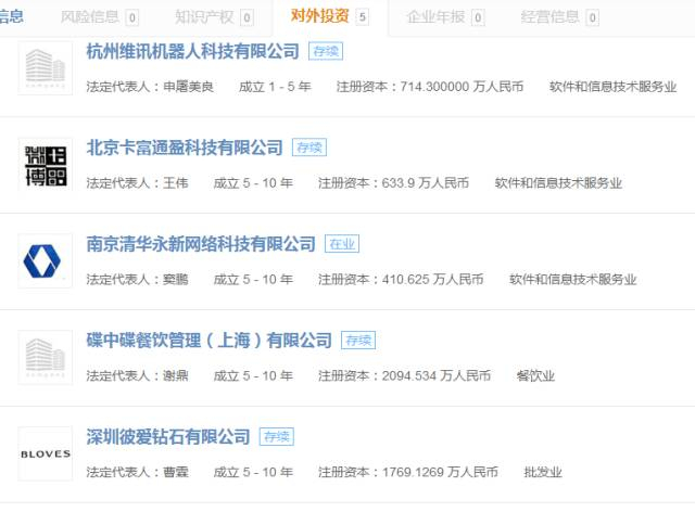 从这5家公司的行业分布也能看出,宁波嘉睦的投资并非仅局限在某个行业领域当中。杭州维讯机器人科技有限公司、北京卡富通盈科技有限公司、南京清华永新网络科技有限公司都属于软件和信息服务业,另外2家公司则分别是餐饮和批发业。总体来看,涉及的方向有: