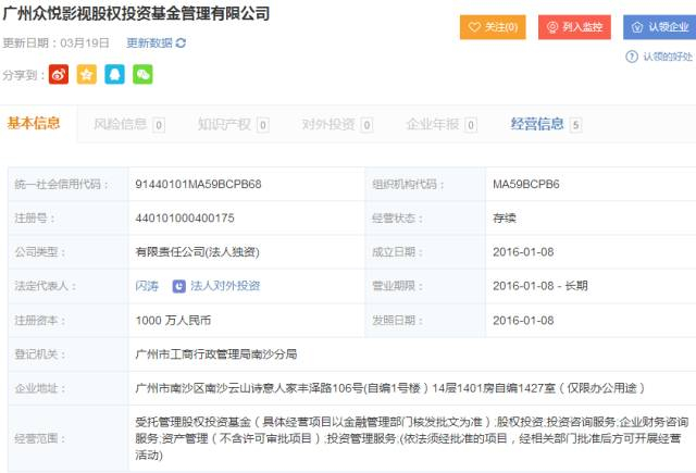 在启信宝上,火山君查询到广州众悦影视股权投资基金管理有限公司成立在去年1月,不过其截至目前的对外投资情况仍无法看到。