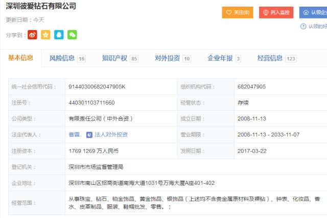 相关资料显示,这是一家主打珠宝、钻石类批发、零售类公司;其目前的4家分支机构都在深圳地区。