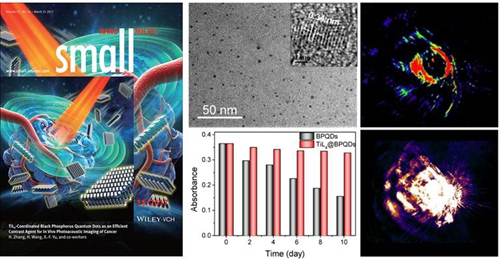 近日,中国科学院深圳先进技术研究院研究员喻学锋、王怀雨与深圳大学教授张晗合作,成功制备出基于黑磷的光声成像造影剂,用于实现高效安全的肿瘤光声成像诊断。相关论文TiL4-CoordinatedBlack Phosphorus Quantum Dots as an Efficient Contrast Agent for In VivoPhotoacoustic Imaging of Cancer(《一种用于体内癌症光声成像的高效造影剂——钛配体修饰黑磷量子点》)作为正封面文章(Front Cover)发表在国际学术期刊Small上,论文第一作者是孙正博。