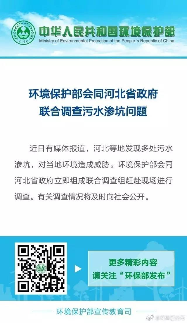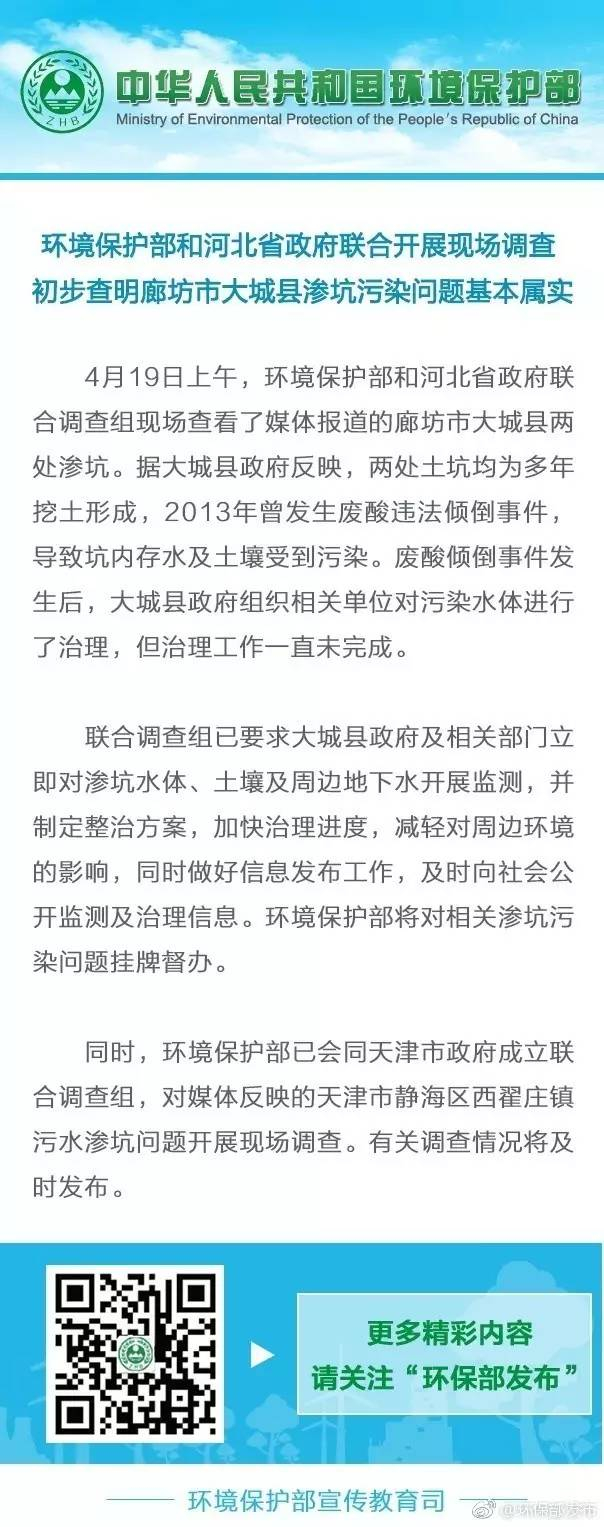 同时,环境保护部已会同天津市政府成立联合调查组,对媒体反映的天津市静海区西翟庄镇污水渗坑问题开展现场调查。有关调查情况将及时发布。