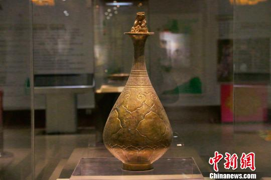 博物馆内展出的国家一级文物——鎏金錾刻人物花卉纹狮钮盖银瓶。 王成前 摄 王成前 摄