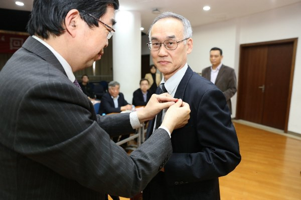黄震为粉川博之教授颁发全职讲席教授聘书,并佩戴上海交通大学校徽。单爱党代表上海交大材料学院对粉川博之教授的加入表示了热烈欢迎。王敏向与会人员简短的介绍了粉川博之教授的有关情况。
