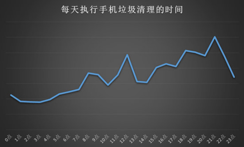 每天清理手机垃圾文件有两个高峰:中午12点、晚上9点。从具体的清理时间曲线看出,在人们集中精力使用手机之前,总是希望通过垃圾清理来优化系统。