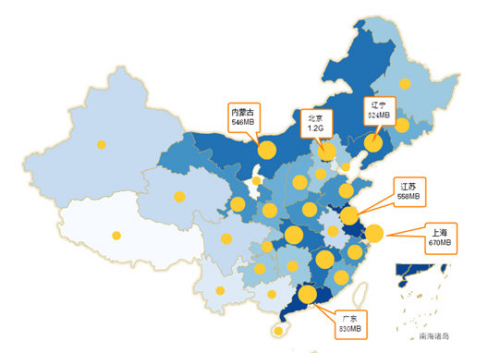 上图为日均垃圾清理地理分布图,日均清理垃圾越多,图片颜色越深。手机垃圾文件量的大小客观上反映出该地区移动互联网的渗透情况。