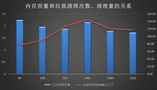 今天的主流智能手机内存容量上32GB的并不少见,一般直觉会认为:手机内存容量越小,越需要垃圾清理,当手机内存容量够大时,就不需要清理垃圾了。然而,数据分析的结果证明直觉错了。