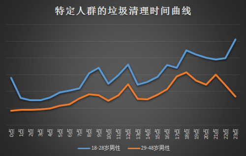 对每天执行垃圾清理的人群进一步细化分析,发现不同人群的清理习惯存在差异。如图所示,18-28岁的男性熬夜的情况比较多见,注意到23-24点,反而是年轻男性清理垃圾的高峰点。继续分析这些人群清理的垃圾文件类型,发现以视频文件居多。