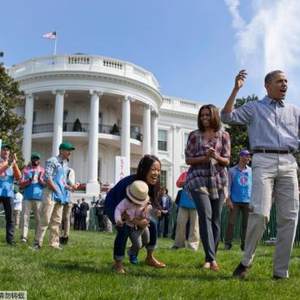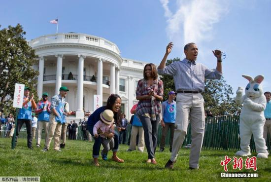 资料图:2014年4月21日,奥巴马夫妇在白宫举行复活节“滚蛋”比赛。上千个孩子在白宫的南草坪上追逐彩蛋。