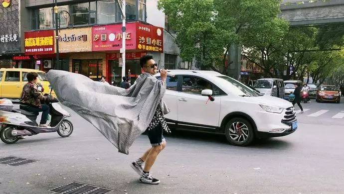 今年3月末,当“格子”穿戴着印满黑白格子图案的围巾、T恤、短裤、袜子和板鞋,并将同样风格的床单披在身上,拖一部小型音响,手握话筒,哼唱粤语歌曲闯进横店影视城的时候,他就在这个“中国好莱坞”出名了。