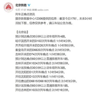 中新网4月21日电 据北京铁路局官方微博消息,据京铁客服中心12306提供的信息:截至今日17时,未来3小时内,北京站、北京西站、北京南站有多趟列车晚点,信息仅供参考,请以车站公告为准。