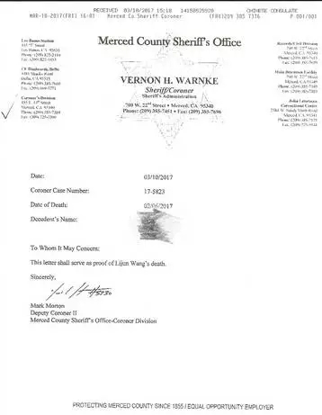王梦称,目前他们手中有中国驻美国旧金山领事馆给美国驻中国大使馆的一封信,记者看到,信里面希望美国驻中国大使馆安排王露的妹妹和叔叔办理美国签证的面试。此外,美国旧金山默塞德警方出示了一份王露的死亡证明。